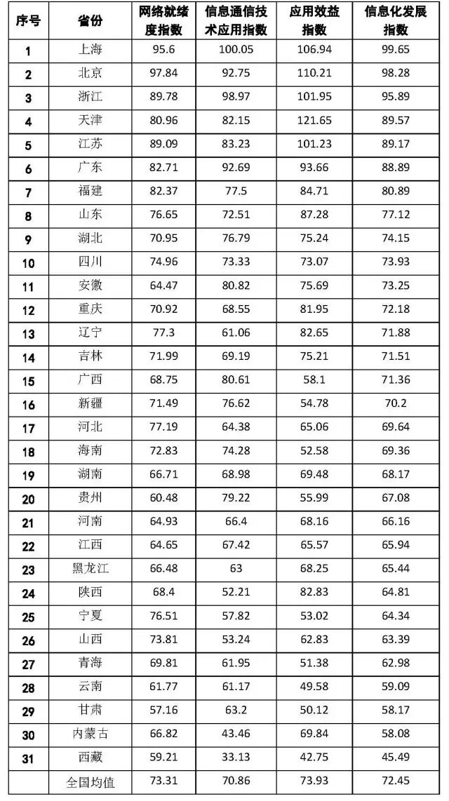 2015年全国信息化发展指数为72.45,比2014年增长了7.69。其中网络就绪度指数为73.31,增长了12.25;信息通信技术应用指数为70.86,增长了6.1;应用效益指数为73.93,增长了1.78。
