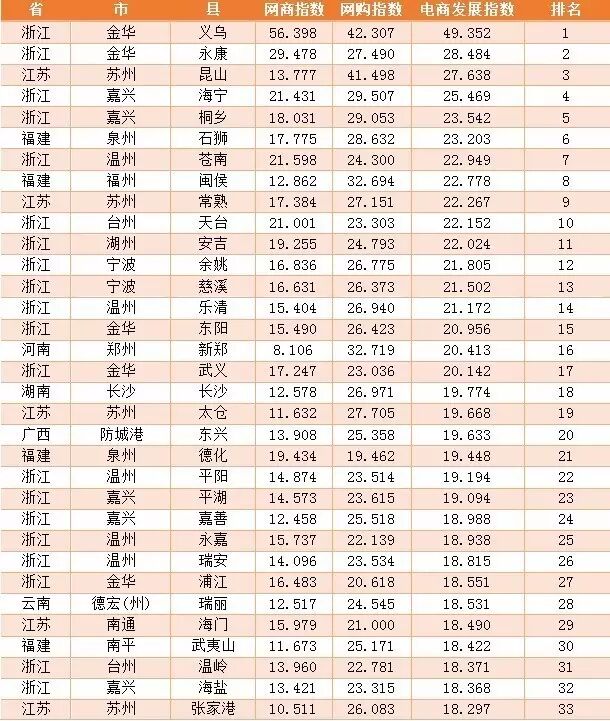 日前,阿里研究院发布2016年“电商百佳县”排行榜,这是阿里研究院根据“阿里巴巴电子商务发展指数(aEDI)”、连续第四年发布“电商百佳县”排行榜。“电商百家县”排名是根据阿里巴巴集团推出的“阿里巴巴电子商务发展指数(AEI)”计算,该指数基于阿里巴巴平台的云数据和全国人口普查数据得出,包括网商指数、网购指数两个一级指标以及四个二级指标,可以较为全面地反映各地电子商务发展情况。