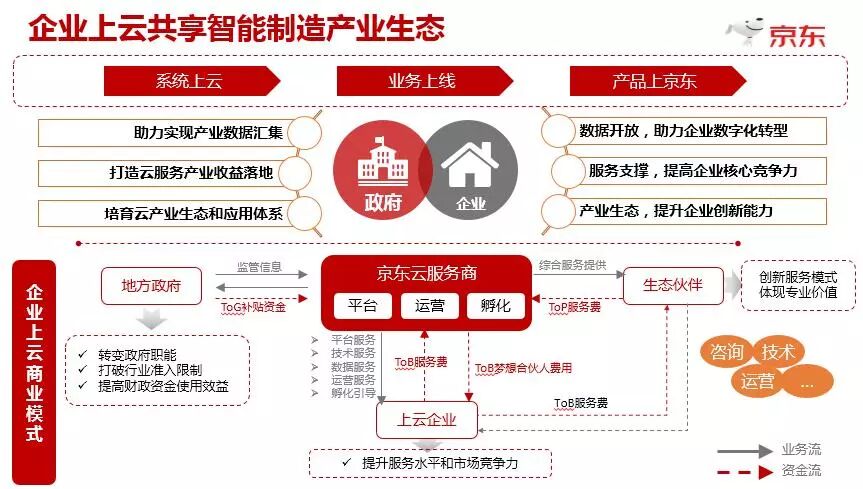 在业务上线层面:上云企业可以通过京东云提供的平台、技术、数据、运营和孵化引导服务,结合生态合作伙伴提供的综合服务,创新服务模式,提升服务水平和市场竞争力;