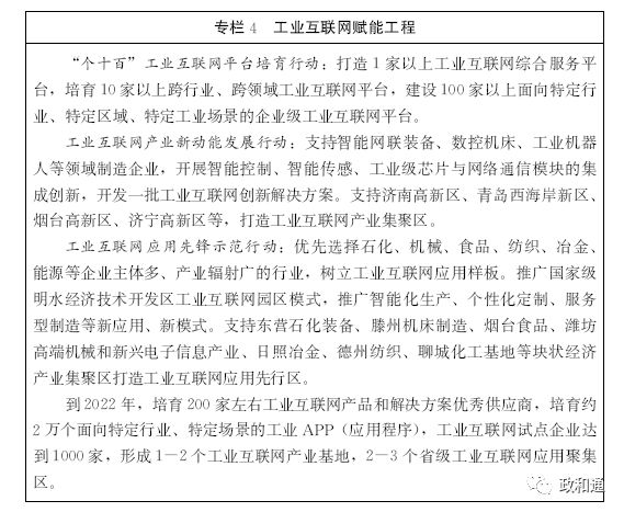 3.提升工业互联网服务能力。实施工业互联网创新发展战略和智能制造工程,支持企业加快数字化、网络化、智能化改造,集中力量攻克关键技术,实施智能制造带动提升行动,培育智能制造生态体系。加快企业内外网技术改造和建设,推动建设低时延、高可靠、广覆盖的工业互联网基础设施。加强工业互联网平台培育,推动大、中、小企业全产业链的数据开放和共享。加快工业互联网创新中心和基地建设,支持和推广一批创新应用试点项目,打造全国一流的工业互联网产业集群。加快构建工业互联网安全保障体系,完善法规制度,强化安全监管,营造安全可靠的发展环境。加强安全技术手段建设,不断提升设备、网络、控制、应用和数据的安全保障能力。