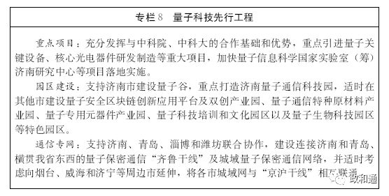 2.推动量子科技和北斗卫星导航产业创新发展。聚焦量子通信、量子测量、量子计算等领域,加强量子调控和量子信息战略性研究,推进量子功能材料和器件研发。建设基于量子密码的新型安全通信网络体系和国家级量子通信网络基础设施共享服务平台,开展量子通信安全、核心关键器件等领域的科技攻关和产业化。积极研发城域、城际、自由空间量子通信技术,开展量子通信网络运营,推动实现量子通信产业化。探索开展量子精密测量和量子计算机研究,推动量子测量应用成果的产品化和量子计算机的物理实现。构建量子技术应用场景和标准,大力推动量子技术在国防、金融、政务、商业等领域的应用。支持济南市建设国际领先的量子技术研发和产业化基地。加大北斗接收机芯片、基带芯片、天线等基础技术研发力度。依托省卫星定位综合服务运营中心,建设全省卫星导航定位基准站网。建设时空信息平台和大数据中心,推进多领域北斗应用示范,促进多种形式的北斗数据深层次应用开发,挖掘位置数据服务的增值效益。