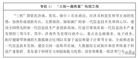 (一)构筑产业发展新格局。强化“三核一廊两翼”协同发展空间布局。按照山东新旧动能转换综合试验区的整体布局,结合我省新一代信息技术产业特色、核心、前沿领域的发展重点,全面统筹规划各地空间布局、功能定位和产业发展,以济南、青岛、烟台为核心节点,发挥胶济铁路沿线科技创新走廊的高端引领和示范带动作用,推动鲁西南与鲁西北两翼联动发展,打造“三核引一廊,一廊领两翼,两翼辐射全省”的新一代信息技术产业发展格局。