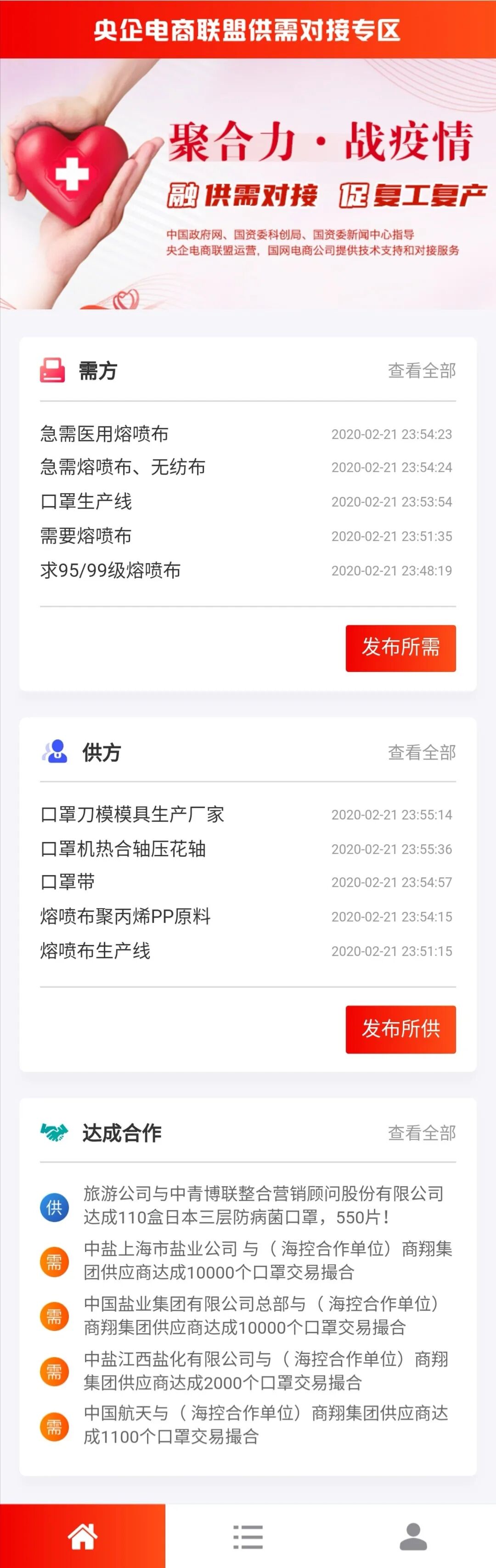 为聚合力、战疫情,融供需对接、促复工复产,有效解决物资供需不对称问题,2月14日,由国资委科创局、国资委新闻中心指导,新华网客户端联合央企电商联盟发起,国网电商公司提供技术支持和对接服务的互联网+医疗防控物资生产供需对接平台正式上线!