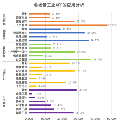 从细分应用场景来看,研发设计中辅助工具类工业APP占比最高,接近27%,例如北京云道智造开发的管道推制金属塑性成型仿真软件,助力企业通过仿真模拟预判产品的合格率。生产制造中主要以设备管理和过程管控为主,两者总的占比超过生产制造类的50%,例如航天云网的设备连接应用为设备提供远程设备数据统一管理,协助企业远程进行设备管控。经营管理类主要聚焦在企业协同方面,占比超过经营管理类总量的37%,例如华为开发的云Welink办公软件为企业提供实时沟通、高效协作、流程管理等办公管理服务,有效帮助企业疫情期间在线远程办公。运维服务中设备监控和预测性维护占据绝对比例,两者之和超过运维服务类总量的70%,例如海尔集团开发的设备远程运维系统,能够实时监测设备状态、分析数据,帮助企业实现设备的预测性维护;疫情防控中员工健康管理占比接近该类场景的48%,例如东方国信开发的疫情防控信息管理系统为企业提供员工健康管理、返工管理等服务,助力企业疫情期间复产复工。
