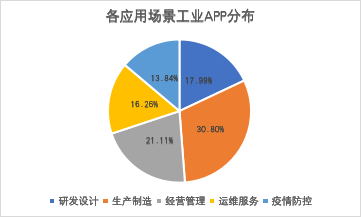 总体来看,在研发设计、生产制造、经营管理、运维服务、疫情防控五类工业APP场景中,生产制造和经营管理类工业APP成为主力军,生产制造和经营管理类工业APP占比超过51%。其中研发设计、运维服务和疫情防控三类各自占比均不超过20%,其中研发设计类占比低于14%。由此可见,软件工具的专业化程度越高,工业APP化服务的门槛也相对越高,而生产制造、经营管理的场景相对多样,工业APP创新空间相对较大。
