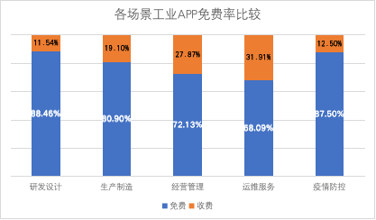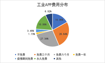 为助力疫情防控和复工复产,大部分工业APP均推出了免费服务或限期优惠服务,能够有效降低用户企业成本负担。一方面,75%以上的工业APP在疫情期间采取不同的免费方式,超过一半的工业APP免费3~6个月,甚至1年或永久免费,接近17%的工业APP直接宣称疫情期间产品免费。从免费工业APP的场景分类看,超过80%的生产制造、研发设计和经营管理类的工业APP疫情期间免费,有助于促进远程办公、远程生产、协同设计等新模式发展,能够切实助力企业复产复工;另一方面,少数由于需要现场定制部署和硬件安装无法免费的工业APP,企业也会在疫情期间进行优惠,帮助企业挺过难关。