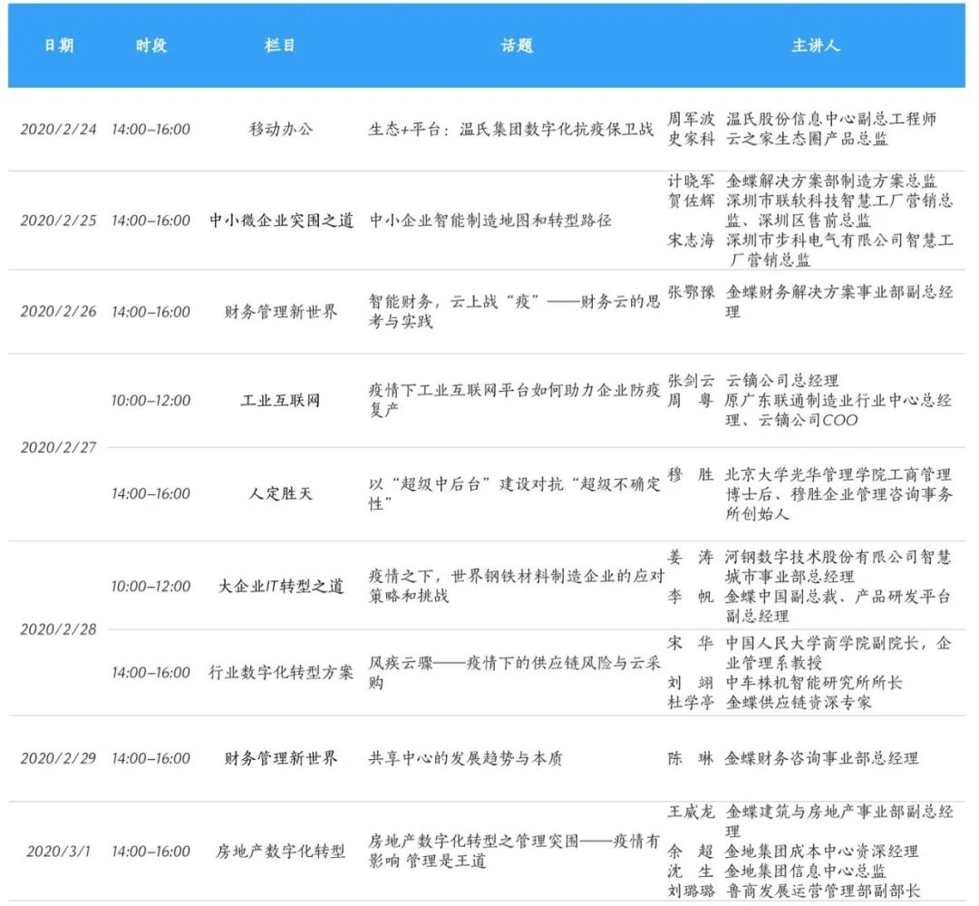 本周金蝶直播除了助企业解决远程办公、企业经营、财务管理、人事管理以及行业转型的问题外,还增加了大企业IT转型之道以及房地产的数字化转型之路。