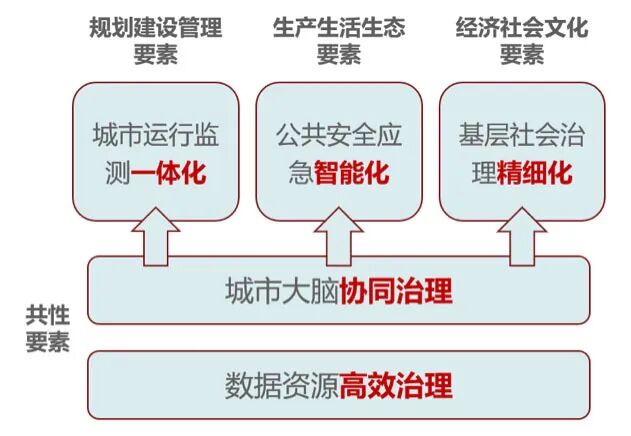 从数字化城市治理的基本内涵看,数字化城市治理体系主要包括五大关键要素:一是数据资源高效治理,数据已然成为经济社会运行的重要生产要素,是构建数字化体系的生产资料;二是城市大脑协同治理,城市大脑作为城市重要基础支撑平台,是智慧城市“三融五跨”的综合载体,是赋能业务数字化转型的技术基石;三是城市运行监测一体化,有力推进城市规划、建设、管理各个环节的统筹发展;四是公共安全应急智能化,有效推动城市生产、生活、生态各个领域的协同发展;五是基层社会治理精细化,全面承载城市经济、社会、文化等各个方面的融合发展。