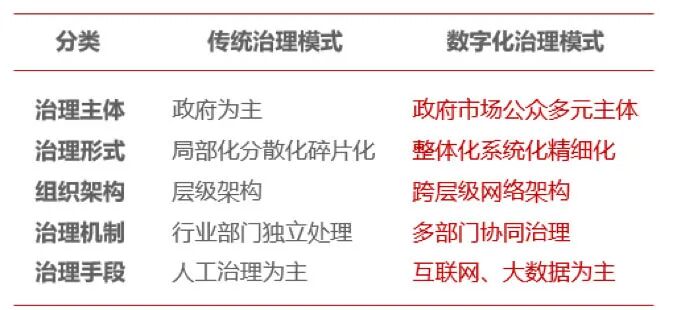 数字化城市治理,是推进城市治理体系和治理能力现代化的重要支撑手段和主要发展方向,是以数据治理为基础,以城市大脑为重要依托,有序推进城市规划建设管理、生产生活生态、经济社会文化各方面向数字化、网络化、智能化迈进的一种新型城市治理模式。与传统经验式城市治理模式相比,数字化城市治理在治理主体、治理形式、组织架构、治理机制、治理手段等方面呈现诸多新特征。
