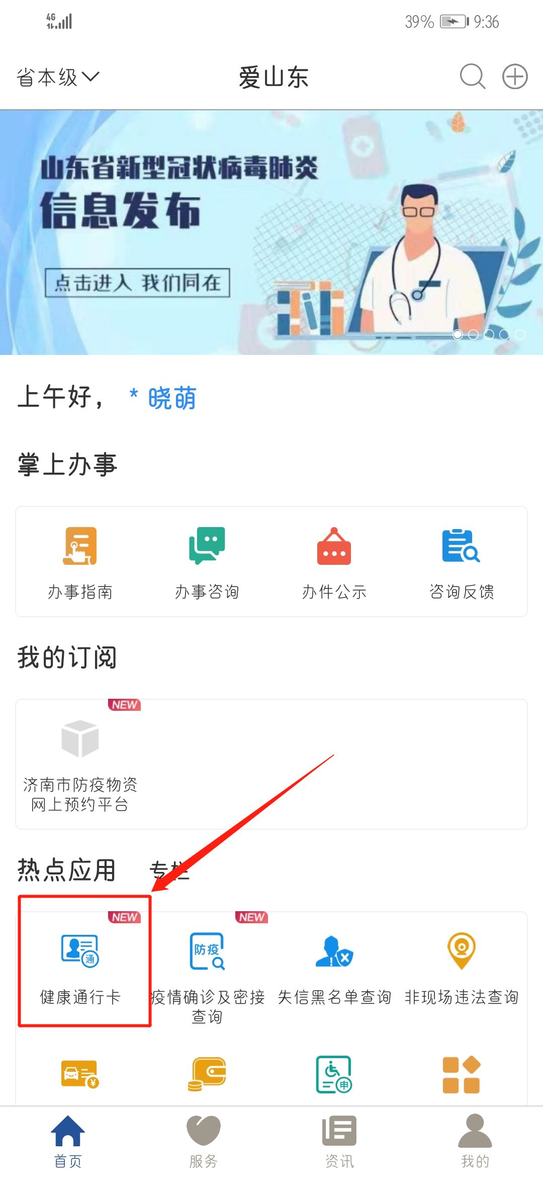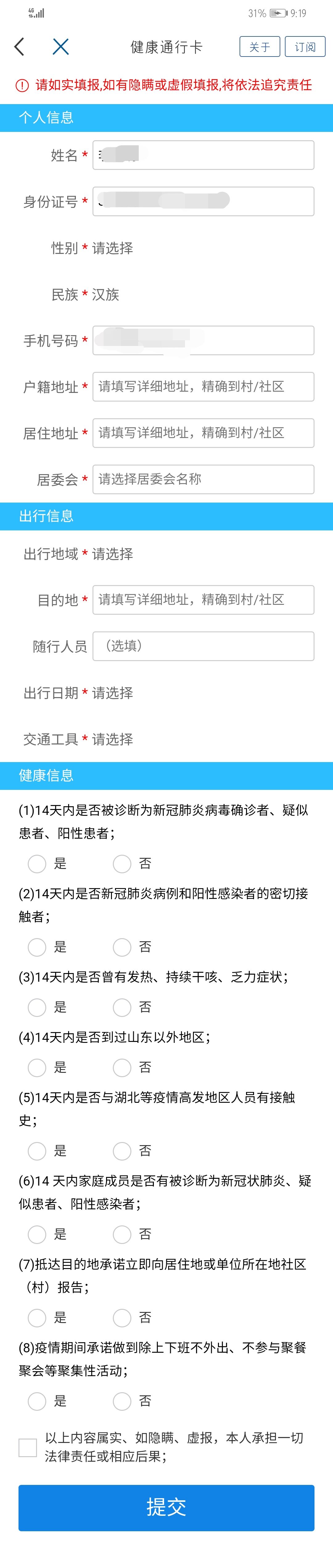 在山东省境内连续居住14天及以上,因复工复学需要出行至异地的,进入山东政务服务app “爱山东”,即可在线申请办理电子健康通行卡。打开“爱山东”,无论您在山东的哪个角落,都可以在首页找到“健康通行卡”入口:电子健康通行卡办理实行出行人自行填报承诺、大数据平台核验、管理人员核验签发三重管理。出行人连续14天以上没有发热(37.3℃以上)、持续干咳、乏力等症状,且排除以下情形的,可申请办理电子健康通行卡:1.被诊断为新冠肺炎确诊病例出院后观察未满14天的;2.疑似病例、阳性感染者,未治愈或隔离观察未满14天的;3.被确定为新冠肺炎确诊病例、疑似病例和阳性感染者的密切接触者,未解除隔离医学观察的;5.与疫情高发省区人员有接触史,隔离观察未满14天的。注意:请务必如实填写,如有隐瞒或虚假填报,将依法追究责任。电子健康通行卡签发后将根据核签情况呈现红色、黄色、绿色三种颜色。
