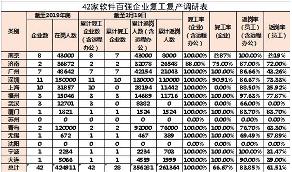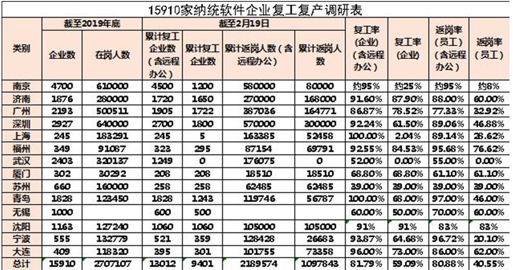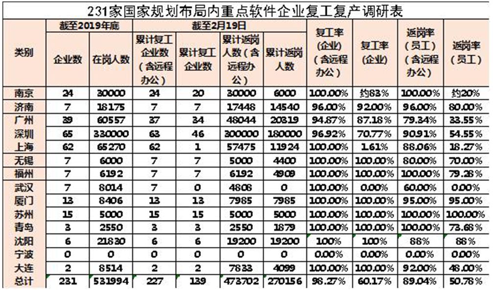 2月23日,习近平总书记在统筹推进新冠肺炎疫情防控和经济社会发展工作部署会议上强调指出:“越是在这个时候,越要用全面、辩证、长远的眼光看待我国发展,越要增强信心、坚定信心。”按照党中央的统一部署,工业和信息化部近日组织召开了全国工业通信业企业复工复产电视电话会议,从分类分批推进企业复工复产、保证运输链正常运转、充分发挥大企业的表率作用、加大对中小企业的帮扶力度、优化政府公共服务等方面作出了安排。同时印发了《关于运用新一代信息技术支撑服务疫情防控和复工复产工作的通知》,提出了16项具体措施。8个综合型软件名城:多措并举为企业复工复产保驾护航