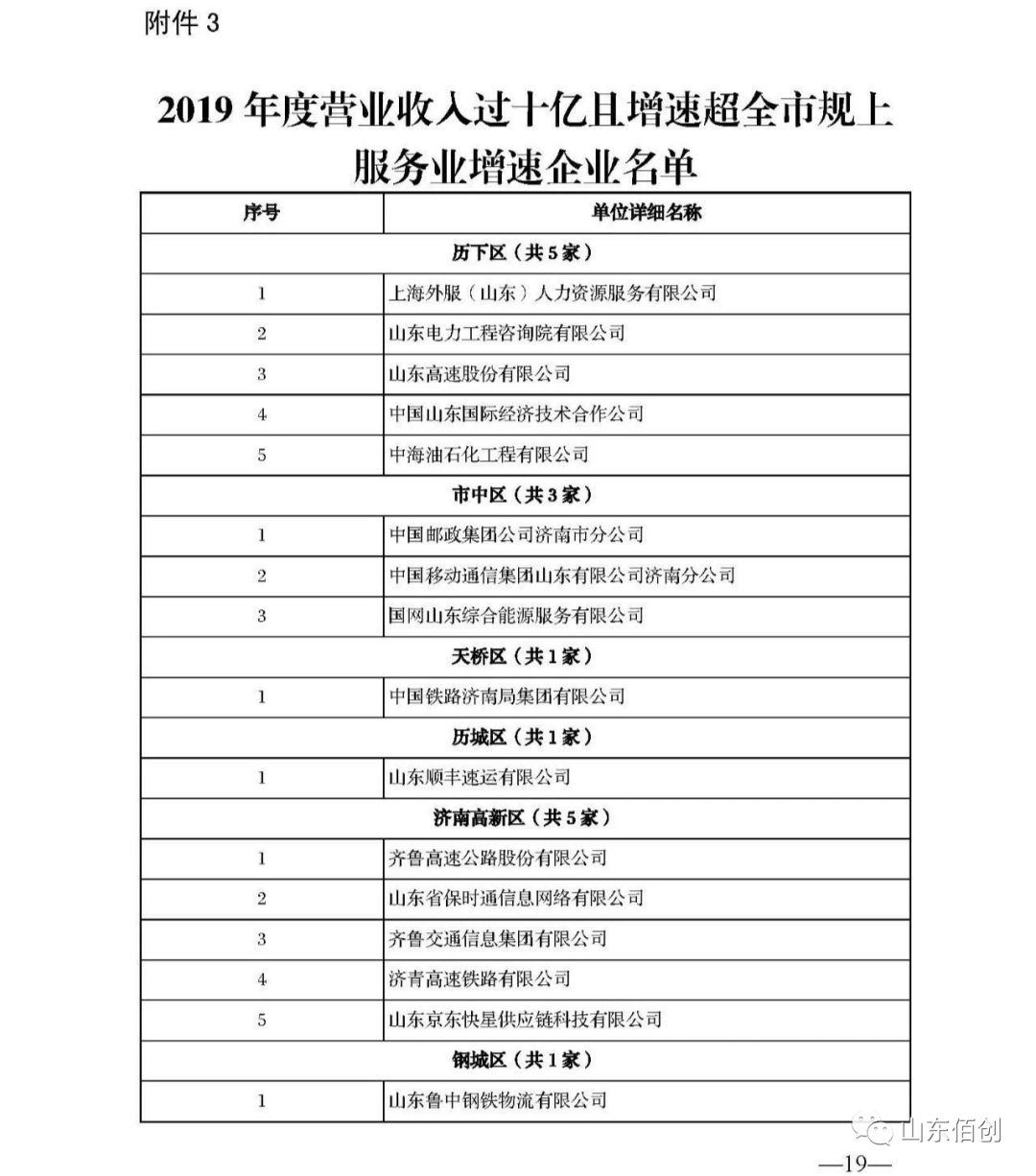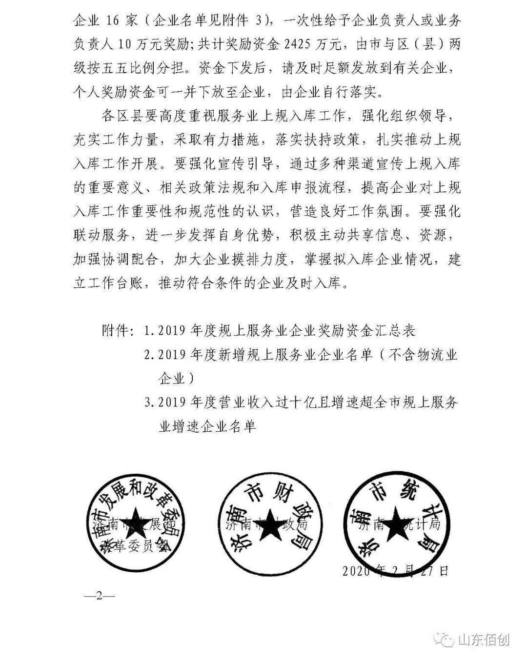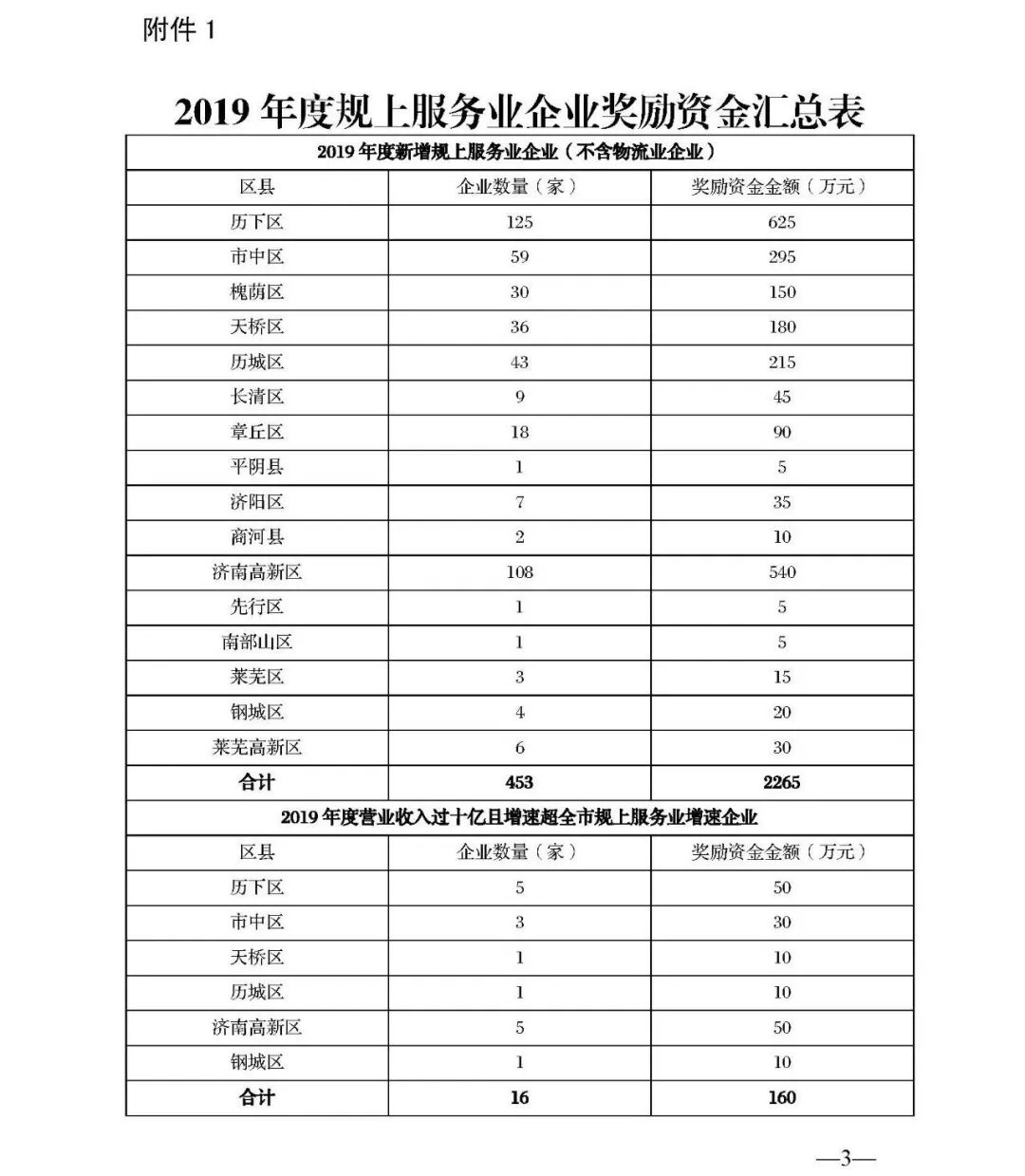 为缓解疫情期间服务业企业经营困境,帮助共渡难关,按照市政府工作部署,现启动规上服务业企业奖励政策落实工作。根据《济南市促进服务业加快发展的若干政策》(济政字〔2019〕73 号)有关规定,经省、市审核的2019年度新增规上服务业企业共453家(不含物流业企业,企业名单见附件1),每家企业奖励资金5万元;年营业收入超过10亿元且增速超过全市平均的服务业企业16家(企业名单见附件2),一次性给予企业负责人或业务负责人10万元奖励;共计奖励资金2425万元,由市与区(县)两级按五五比例分担。资金下发后,请及时足额发放到有关企业,个人奖励资金可一并下放至企业,由企业自行落实。