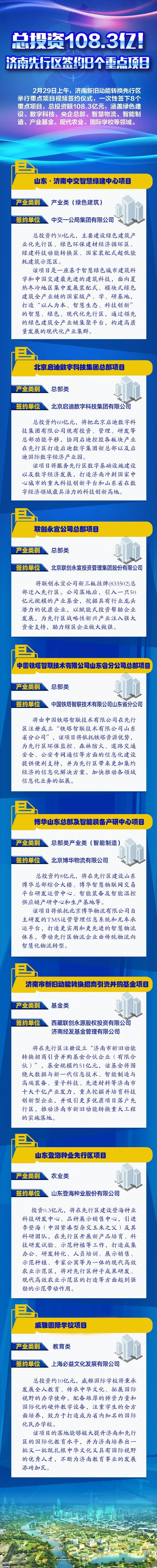 2月29日上午,济南新旧动能转换先行区通过视频连线方式举行重点项目集中签约仪式,本次共签约8个项目,总投资约108亿元,项目涵盖绿色建设、数字科技、央企总部、智慧物流、智能制造、产业基金、现代农业、国际学校等领域。