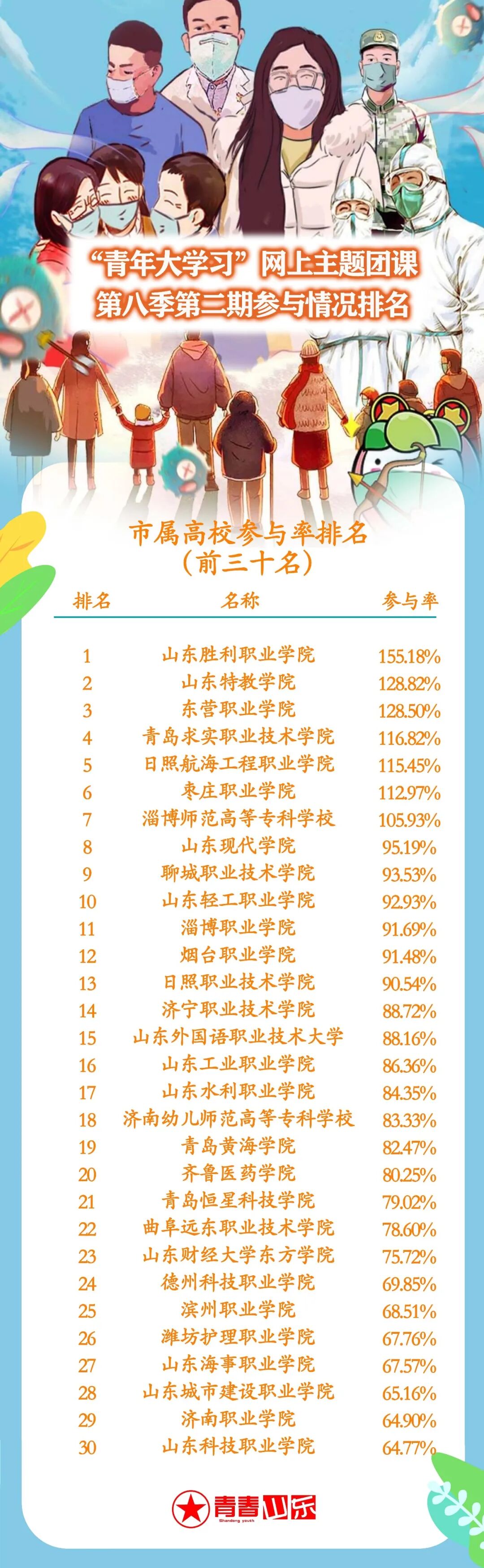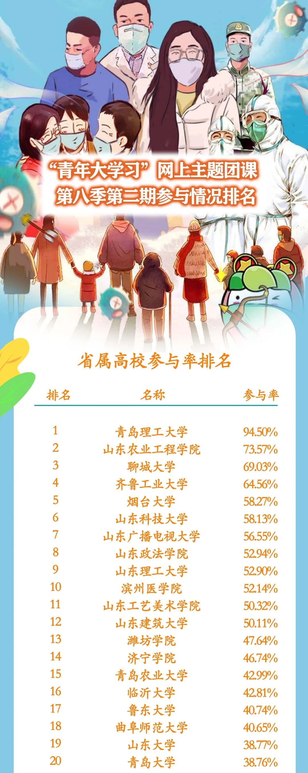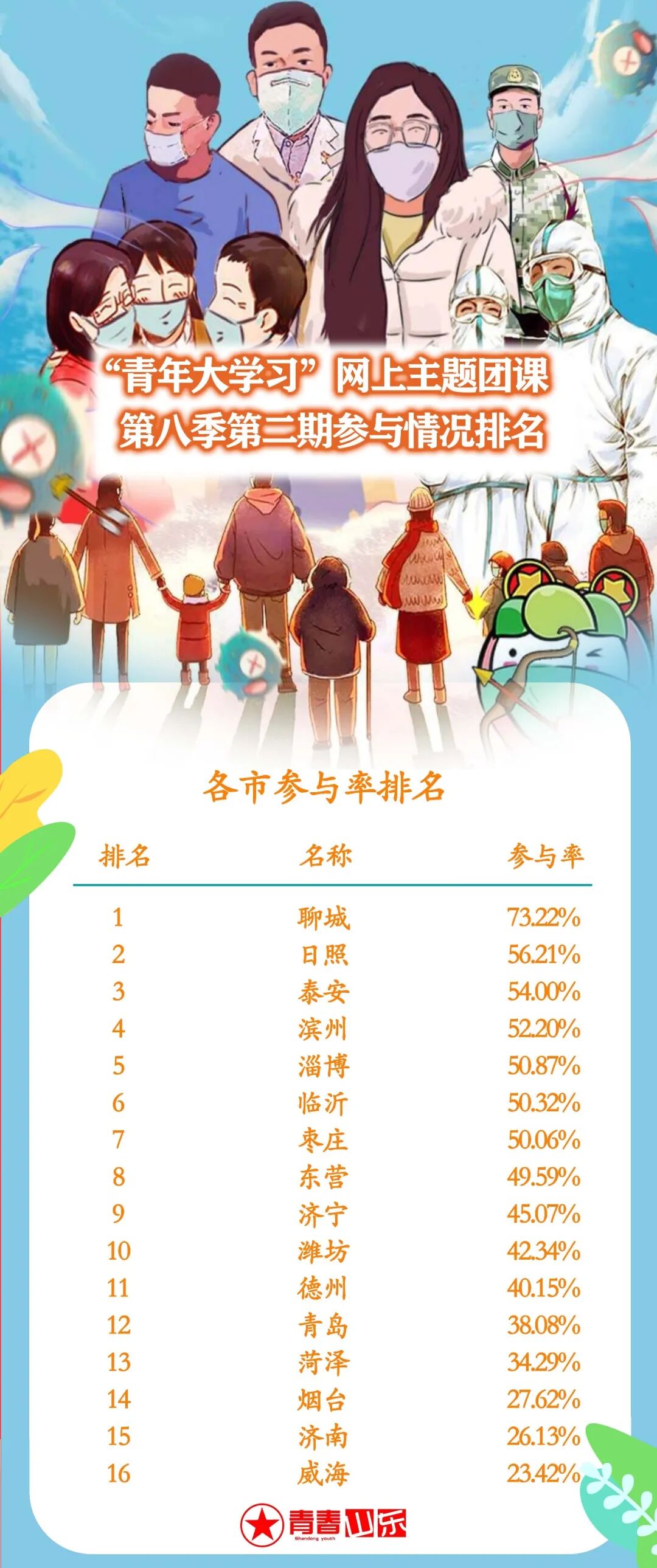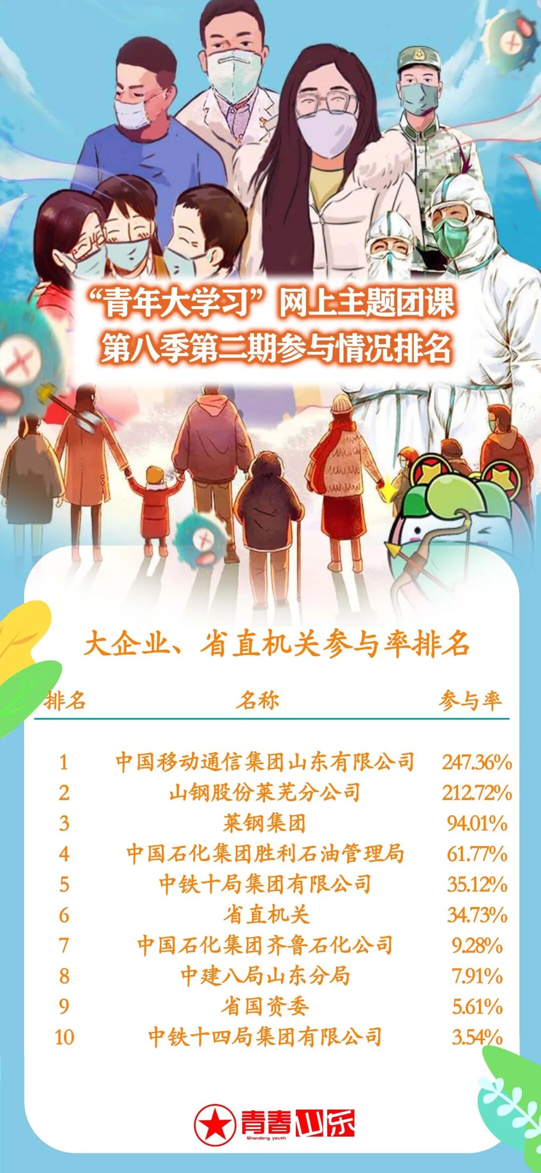 第八季第二期“青年大学习”中,有4个单位的参与率超过50%,其中参与率最高的是中国移动通信集团山东有限公司,以247.36%的参与率排名第一位,山钢股份莱芜分公司以212.72%排名第二。希望差距较大的单位继续加把劲,在接下来的学习中有较优异的表现。