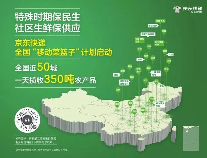 另一边,疫情发生后的湖北襄阳,封闭式管理的市民买不到菜了,而农户手里有菜却卖不掉、运不出。为解决疫情期间生鲜蔬菜供需的“两头难”问题,京东快递“移动菜篮子”计划在全国铺开,目前已在全国近50个城市落地实施,一天揽收近350吨农产品。该计划通过政企合作、社区团购、B2C同城配等合作模式,为守好全国老百姓的“菜篮子”保驾护航。